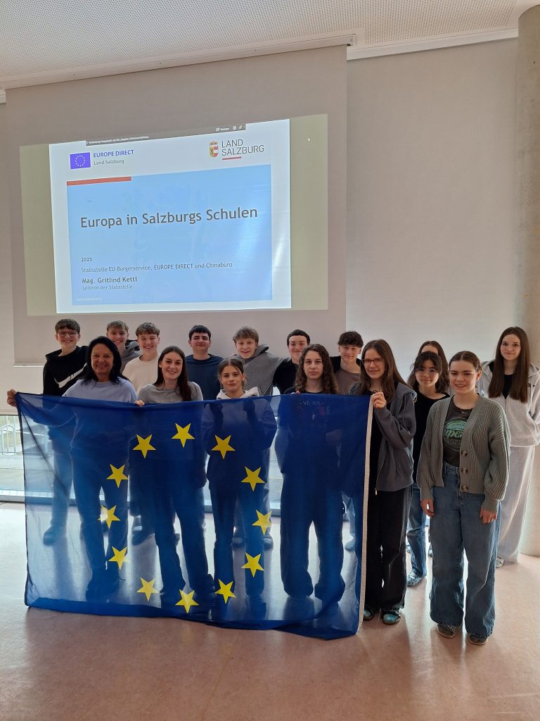 Am 28. Februar 2025 besuchte Gritlind Kettl, Leiterin von EUROPE DIRECT Land Salzburg, unsere Schule im Rahmen der Initiative „Europa in Salzburgs Schulen“. Die SchĂĽlerinnen und SchĂĽler der 6. Klassen hatten die Gelegenheit, an einem informativen Vortrag zum Thema Europa teilzunehmen. Diese Initiative des Landes Salzburg zielt darauf ab, Europa fĂĽr junge Menschen greifbar und erlebbar zu machen.