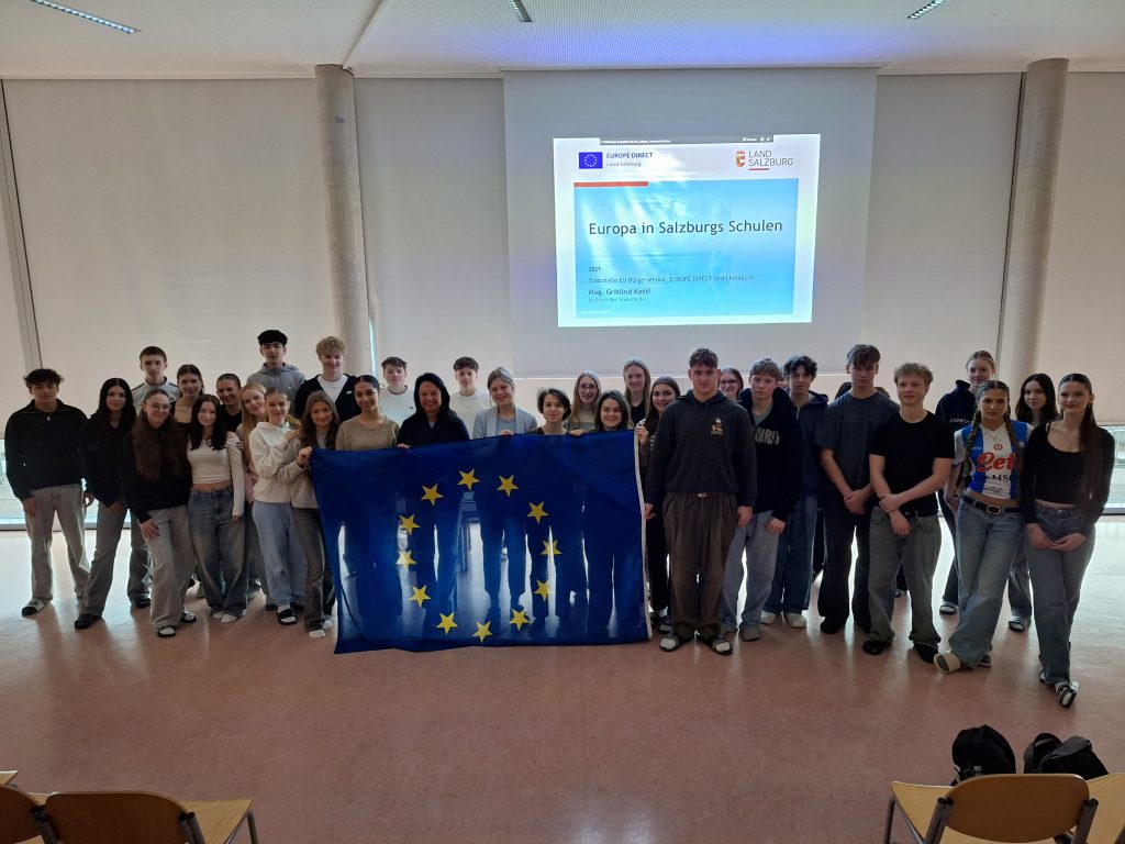 Am 28. Februar 2025 besuchte Gritlind Kettl, Leiterin von EUROPE DIRECT Land Salzburg, unsere Schule im Rahmen der Initiative „Europa in Salzburgs Schulen“. Die SchĂĽlerinnen und SchĂĽler der 6. Klassen hatten die Gelegenheit, an einem informativen Vortrag zum Thema Europa teilzunehmen. Diese Initiative des Landes Salzburg zielt darauf ab, Europa fĂĽr junge Menschen greifbar und erlebbar zu machen.