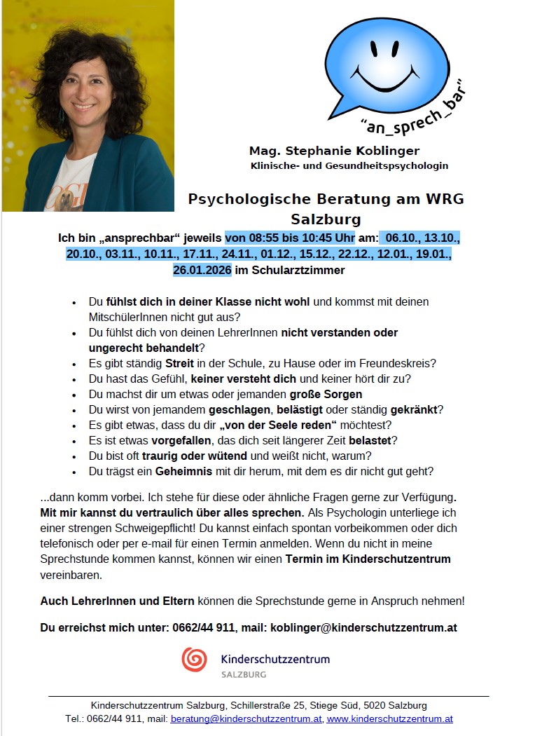 Erreichbarkeit fĂĽr Eltern am Besten per Mail: reindl.ingrid@wrg.salzburg.at